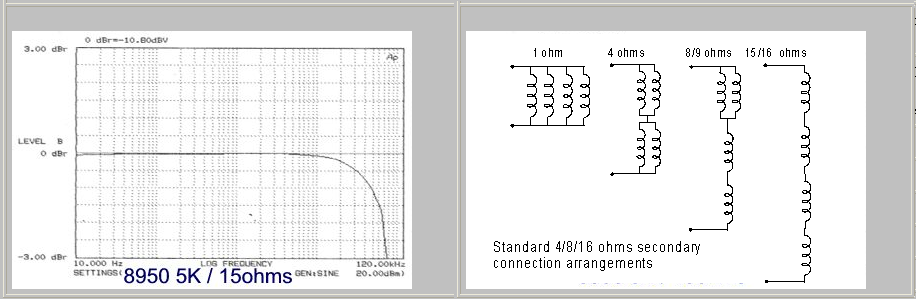 Primário 5000 Ohms Nominal (4569 Ohms Reais); Impedâncias de saída 1.7, 2.9, 6.8, 8.3 e 15.2 Ohms.