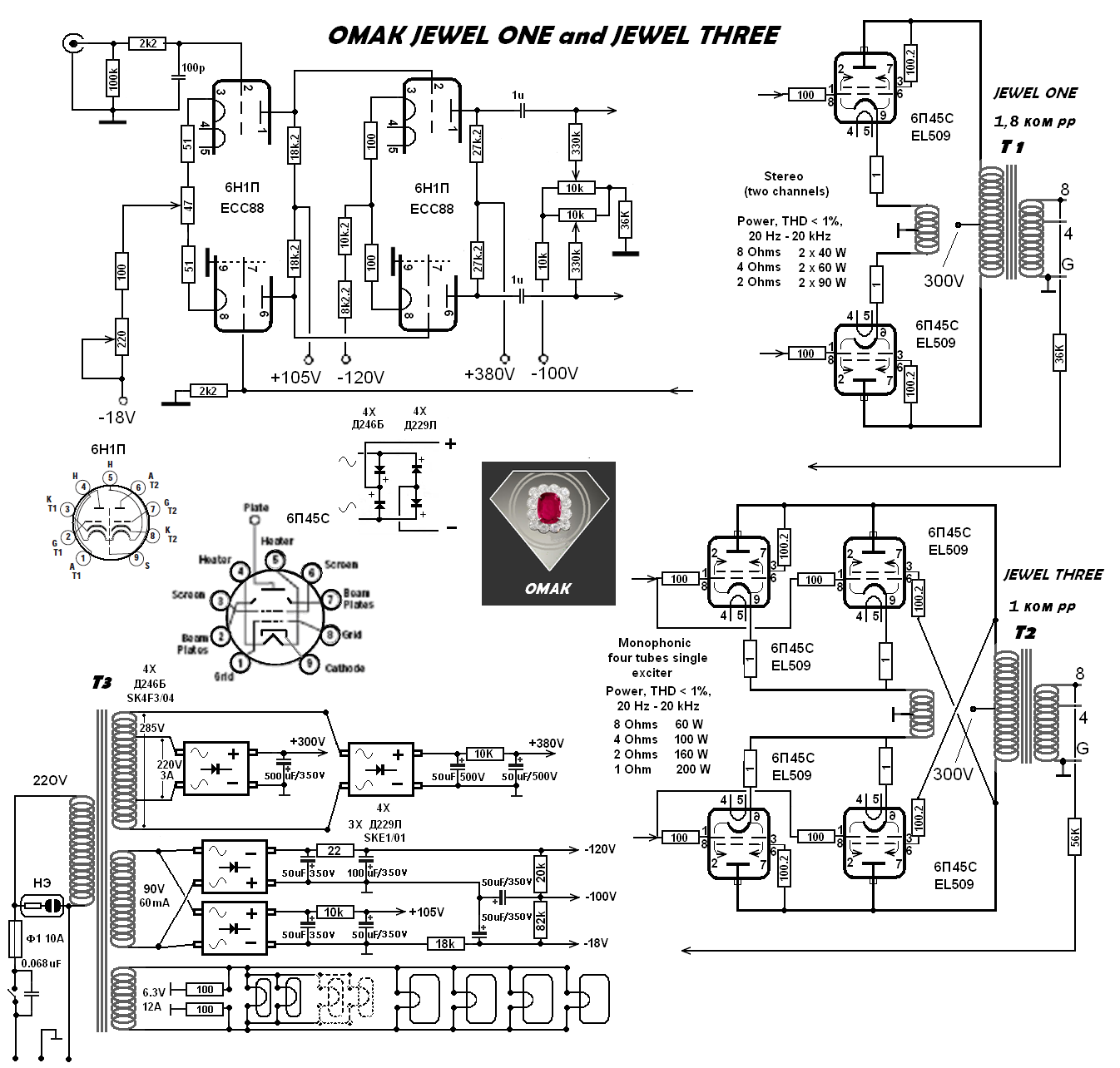 O Jewel One é um amplificador estéreo puramente triodo em classe “A” O jewel Three que utiliza o mesmo chassis e métodos construtivos é mono com uma configuração especial. Duas válvulas operam em classe triodo e duas em classe pentodo. Até ai nada de mais. O grande detalhe é a alimentação de grade na placa da válvula simétrica. Um sistema típico da Mc Intosh. O comentário original da fábirica diz sem citar nomes ou marcas que o sistema é conhecido desde o final dos anos ’40. Na configuração apresentada as quatro válvulas trabalham em classe “A” com baixos sinais. À medida que o sinal aumenta vai progressivamente para as classes AB’1 , AB’2 e chega ao seu limite praticamente entrando na classe B sem que haja corrente na grade de sinal.