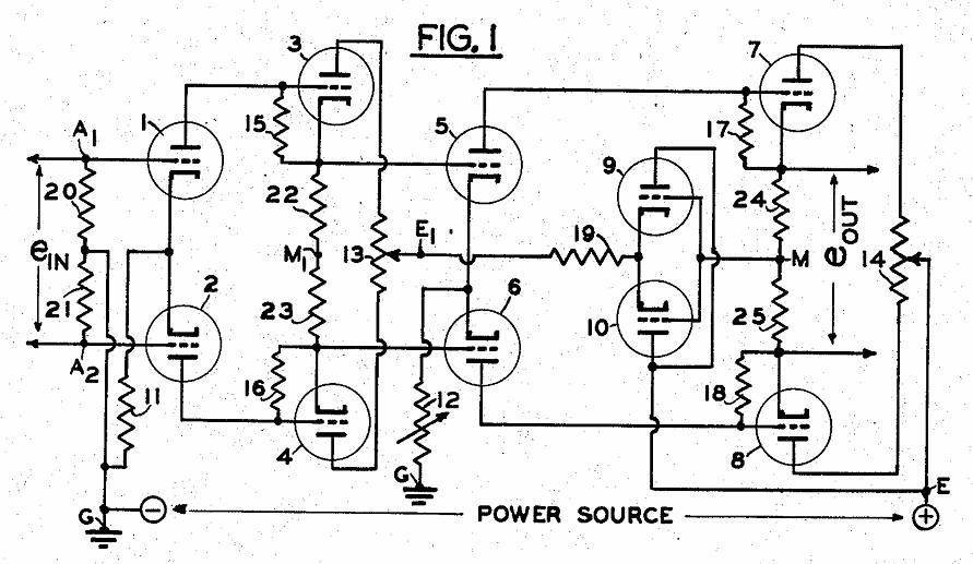 Significa dizer que: as polarizações de grade das válvulas 10 e 11 são controladas pelas tensões que se desenvolvem nos resistores 39 e 40 das válvulas 12 e 13.