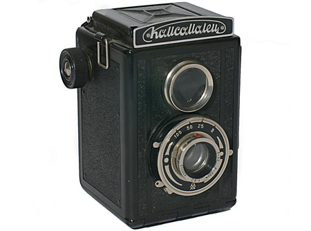Appropriately named after the Communist Youth organization “Komsomol,” this camera is one of the very first products created by the burgeoning Soviet photo industry. It is also the very FIRST TLR camera created in the Soviet Union. Overall, it’s pretty much an exact copy of the original non-focusing Voigtländer Brilliant, albeit with a few simplifications to the body design. It’s produced in Bakelite – a predecessor to modern-day plastics. Although the focusing Voigtländer Brilliant was released eight years earlier, the Komsomolets was modeled after the first Brilliant, so the taking and viewing lenses are not connected.